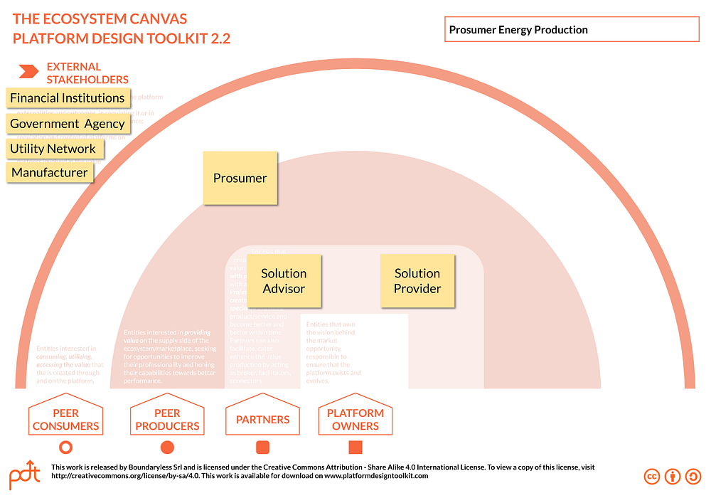 First thing to do in this case is to get to map the entities-roles in the Ecosystem Canvas: having completed the transformed Wardley Map we can pick from there. As a quick reflection: we are here considering a simple case for educational purposes, but more scenarios could be considered such as energy trading or in the development of local micro-grids. On this map, please note that solar panel manufacturers are seen as stakeholders, since their products are nowadays pure commodities and the value of this ecosystem is accrued elsewhere.
